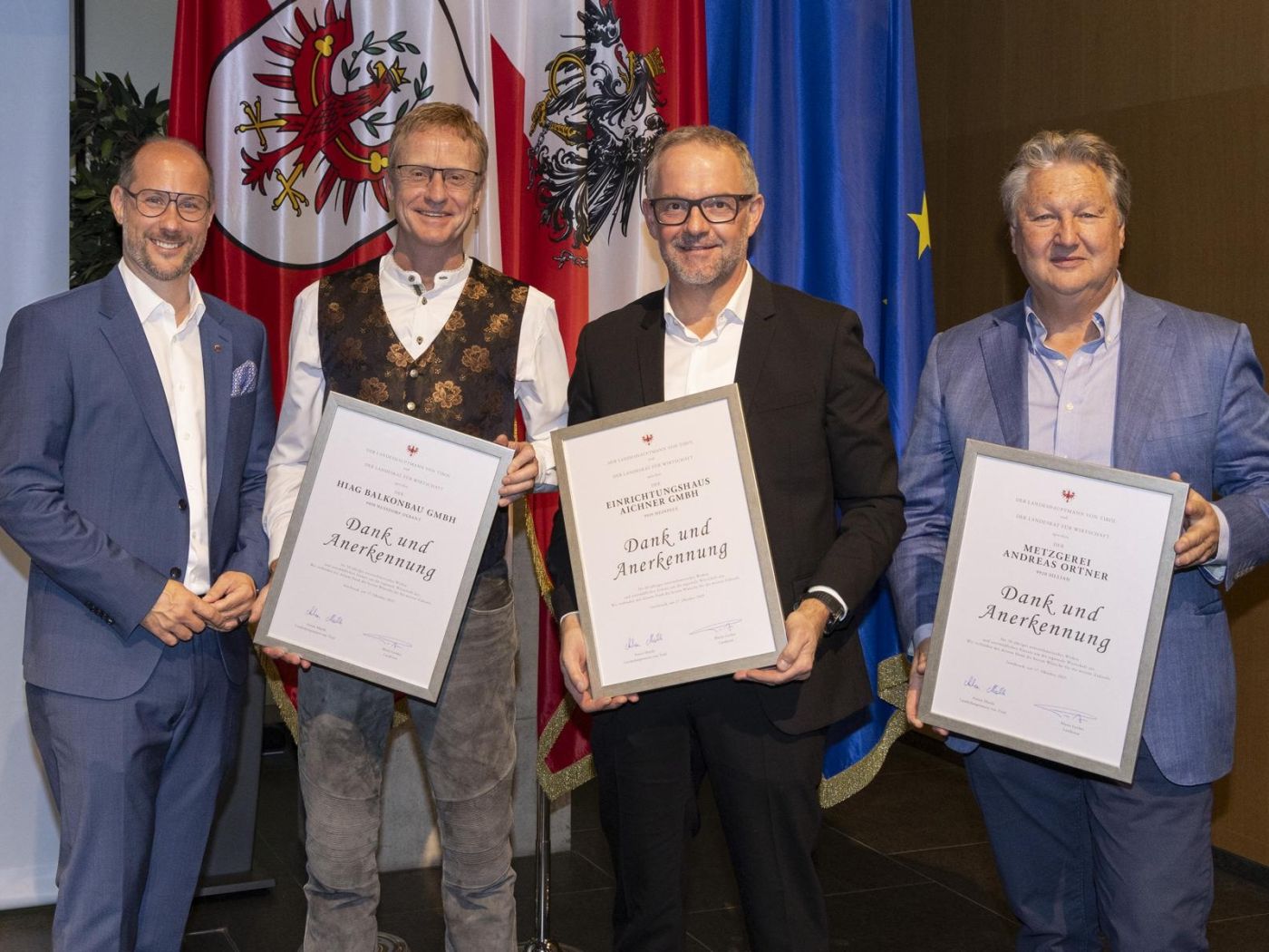 Wirtschaftslandesrat Mario Gerber hat am Freitagabend im Innsbrucker Landhaus 20 Tiroler Traditionsbetriebe ausgezeichnet. Diese Ehre wird Unternehmen zuteil, die auf mindestens 30 Jahre Unternehmensgeschichte zurückblicken können. Auch drei Osttiroler Unternehmen sind heuer als „Tiroler Traditionsbetriebe 2025“ ausgezeichnet worden. Geehrt wurden die Unternehmen Fleischwaren Ortner GmbH & Co. KG (70 Jahre) aus Sillian, das Einrichtungshaus Aichner GmbH  (60 Jahre) aus Heinfels und die Hiag Balkonbau GmbH (50 Jahre) aus Nußdorf-Debant.