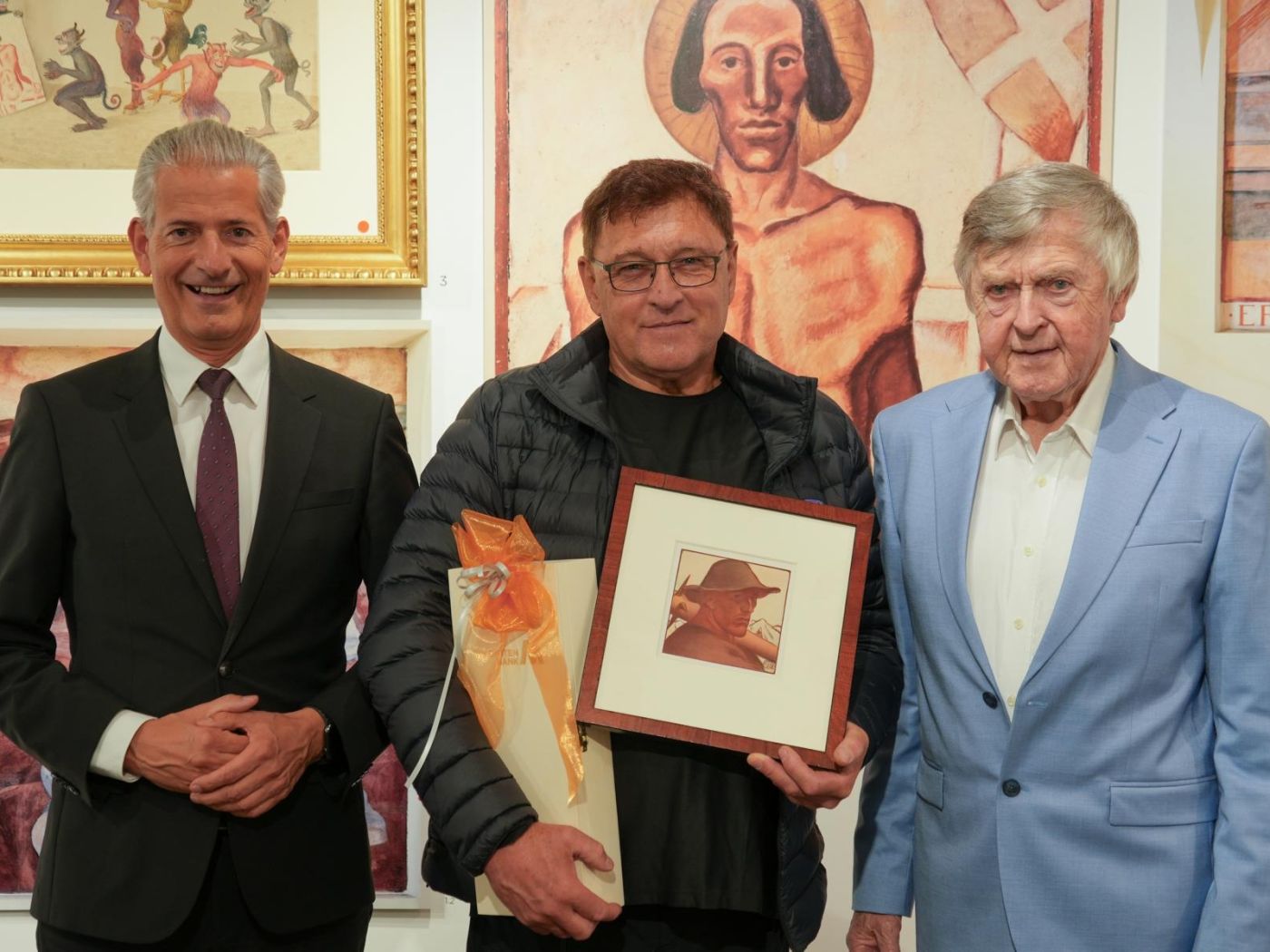 Diese Woche hat der 1.000ste Besucher die aktuelle Ausstellung in der Dolomitenbank Galerie besucht. Direktor Hansjörg Mattersberger und Kurator Erich Mair begrüßten Oswald Gurschner aus Leisach mit einer besonderen Überraschung: er bekam eine kleine Reproduktion aus dem „Totentanz“ von Albin Egger-Lienz überreicht.