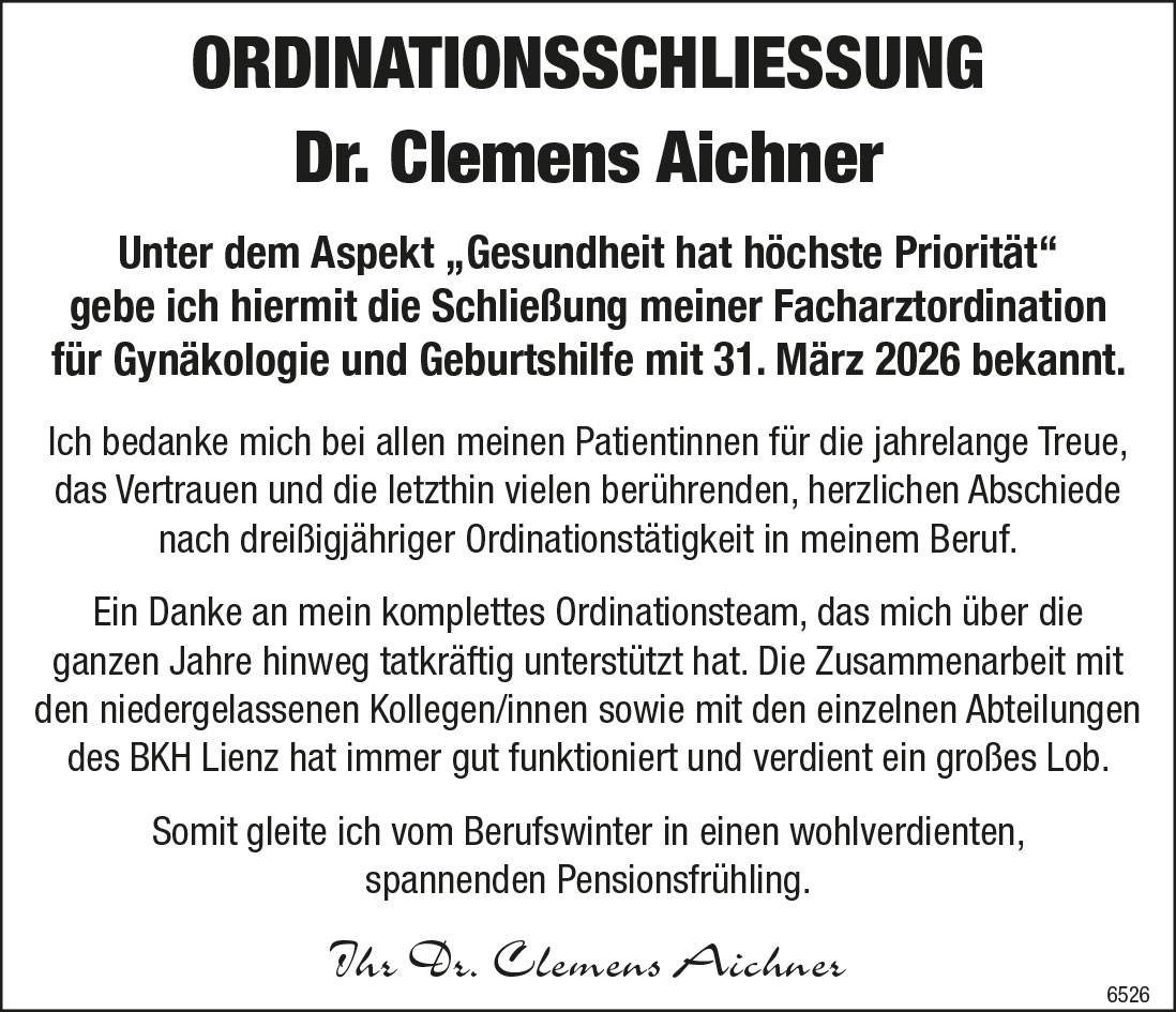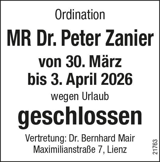 • Datumsangabe Bereitschaft: Montag, 6. April, von 9 bis 21 Uhr: , Text Bereitschaft: Dr. Peter Helmut Zanier, Fanny Wibmer-Pedit-Straße 9, Lienz, Tel. 141. Ordination von 10 bis 11 Uhr.