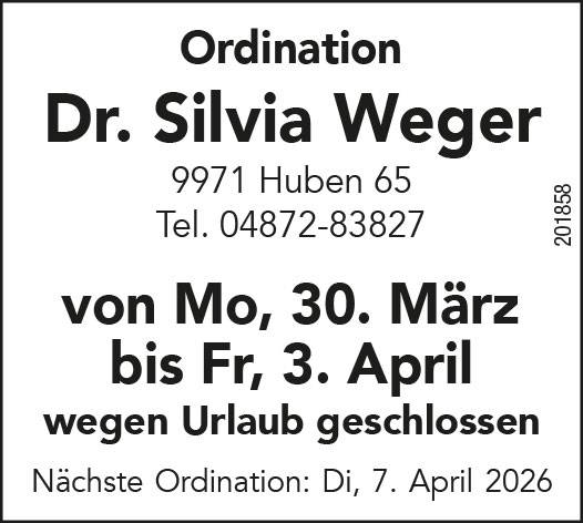 • Datumsangabe Bereitschaft: Montag, 6. April: , Text Bereitschaft: Dr. Silvia Weger, Huben 65 (blauer Container), Matrei i. O. Praxistelefon: 04872-83827. Ordination von 9 bis 11 Uhr.