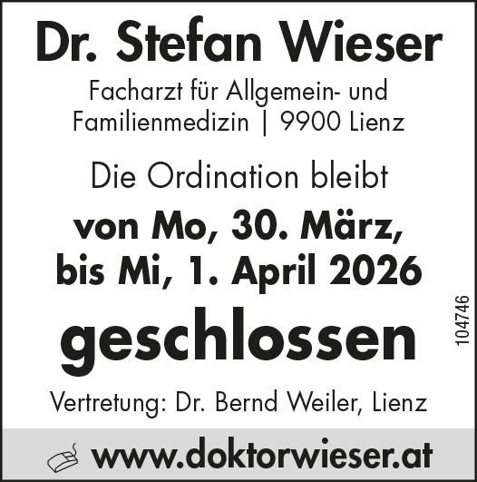 • Datumsangabe Bereitschaft: Samstag, 4., und Sonntag, 5. April, jeweils von 9 bis 21 Uhr: , Text Bereitschaft: Dr. Stefan Wieser, Alleestraße 5, Lienz, Tel. 141. Ordination: Samstag und Sonntag von 9 bis 11 Uhr und nach telefonischer Vereinbarung.