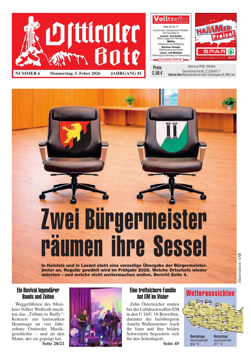 Erleben Sie die neuesten Nachrichten und Geschichten aus der Region – direkt im digitalen Zeitungsformat! Hier können Sie die aktuellsten Ausgaben von regionalen Zeitungen wie dem Osttiroler Bote und dem Oberkärntner Volltreffer online lesen und sich umfassend über das Geschehen vor Ort informieren. Bleiben Sie nah dran an den Themen, die unsere Region bewegen.