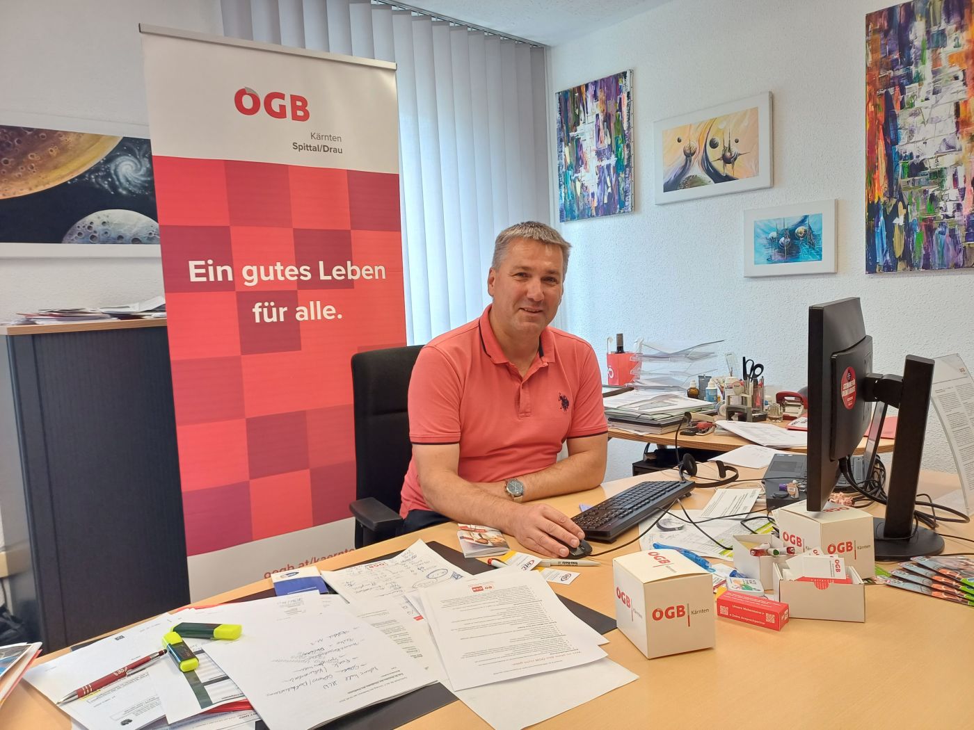 ÖGB-Regionalsekretär Andreas Unterrieder in seinem Büro in der Spittaler Lutherstraße – Ansprechpartner für über 10.000 Mitglieder im Bezirk.