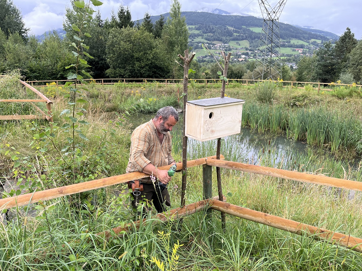Die Mitglieder von Birdlife Oberkärnten Gabi und Bernhard Huber und Seebodens Jagdreferent Horst Zwischenberger haben das Tier dann in Empfang genommen und zur weiteren professionellen Versorgung an Michaela Dworak von der Vogelhilfe Kärnten übergeben. Mitte der ersten Septemberwoche am späten Nachmittag konnte der erholte Jungvogel bei prachtvollem Wetter beim Wiednighof der Familie Gritzner in Lieserhofen wiederin die Freiheit entlassen werden. In den nächsten Tagen wird er in sein Winterquartier nach Zentralafrika südlich der Sahara ziehen und hoffentlich nächstes Jahr wiederkommen. Der markante Vogel mit dem langen gebogenen Schnabel und kontrastreichen Gefieder ist äußerst auffällig. Ebenso die aufgerichtete Federhaube und der gaukelnde schmetterlingsartige Flugstil lassen den Wiedehopf leicht erkennen. Seine Hauptnahrungsquelle sind Maulwurfsgrillen und das bevorzugte Habitat des Höhlenbrüters in Oberkärnten sind alte Obststreuwiesen. Man hofft, diese Vögel in der Gegend nun öfter anzutreffen. Dazu wurden in der Umgebung des Weidinghofes und auch am Naturlehrpfad am Lurnbichl Widehopf-Nistkästen angebracht.