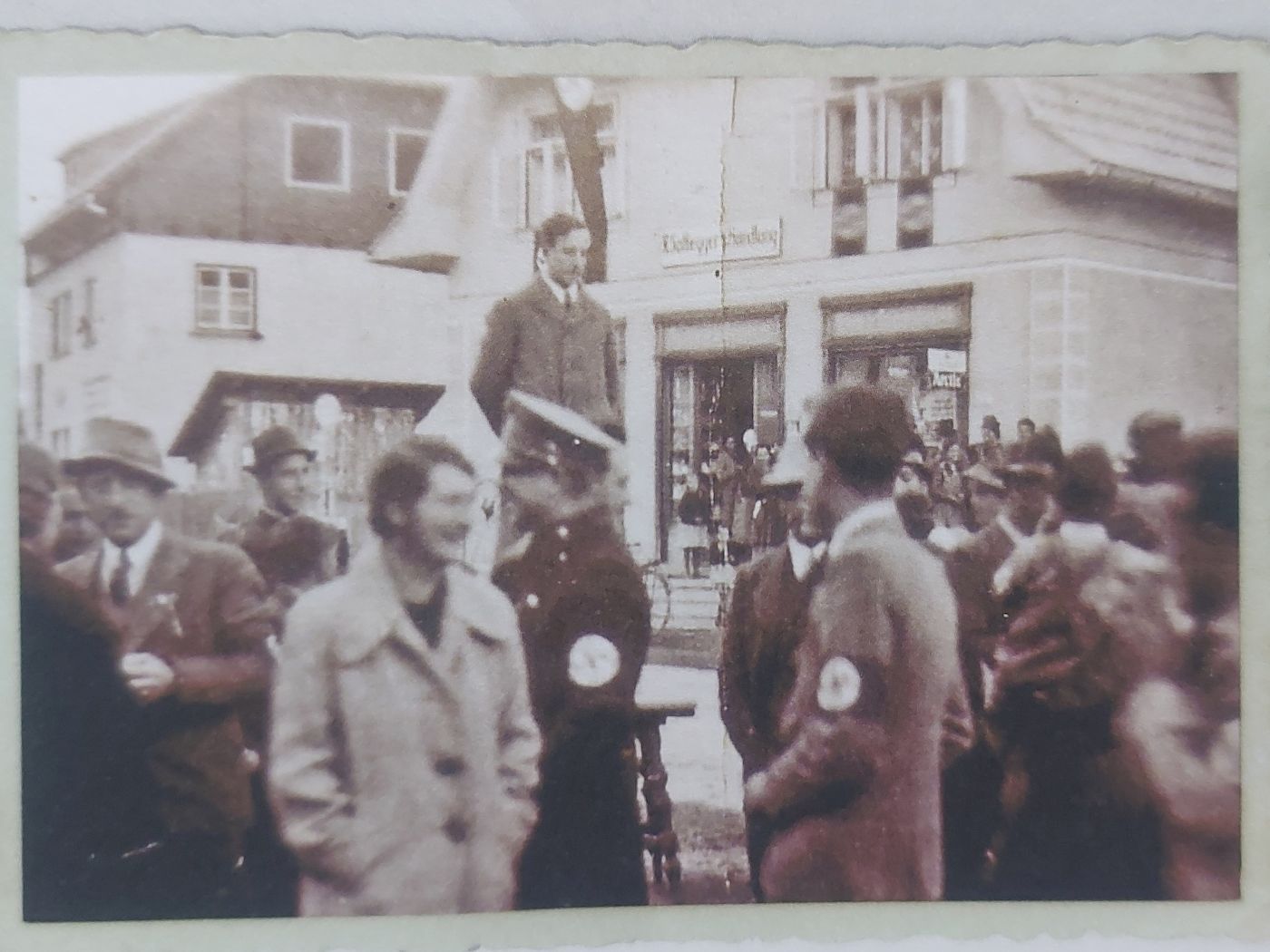 Auf der Einladung zur Ausstellung ist diese Abbildung: Dellach im Drautal, März 1938, Entwürdigung des christlich-sozialen Dorflehrers Lorenz Lexer. (Foto: privat)