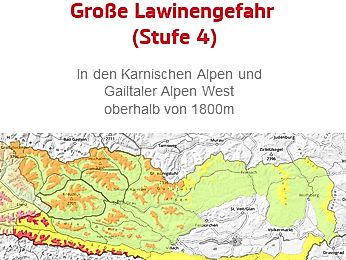 Der Lawinenwarndienst aktualisiert auf Grund der aktuellen Wetterlage laufend seine Informationen. Abseits gesicherter Pisten besteht eine kritische Lawinensituation für Wintersportlerinnen und Wintersportler! Die Lawinengefahr steigt entlang der südlichen Landesgrenze in den Karnischen Alpen und in den Gailtaler Alpen West oberhalb von 1800 m auf Gefahrenstufe 4 – Große Lawinengefahr!