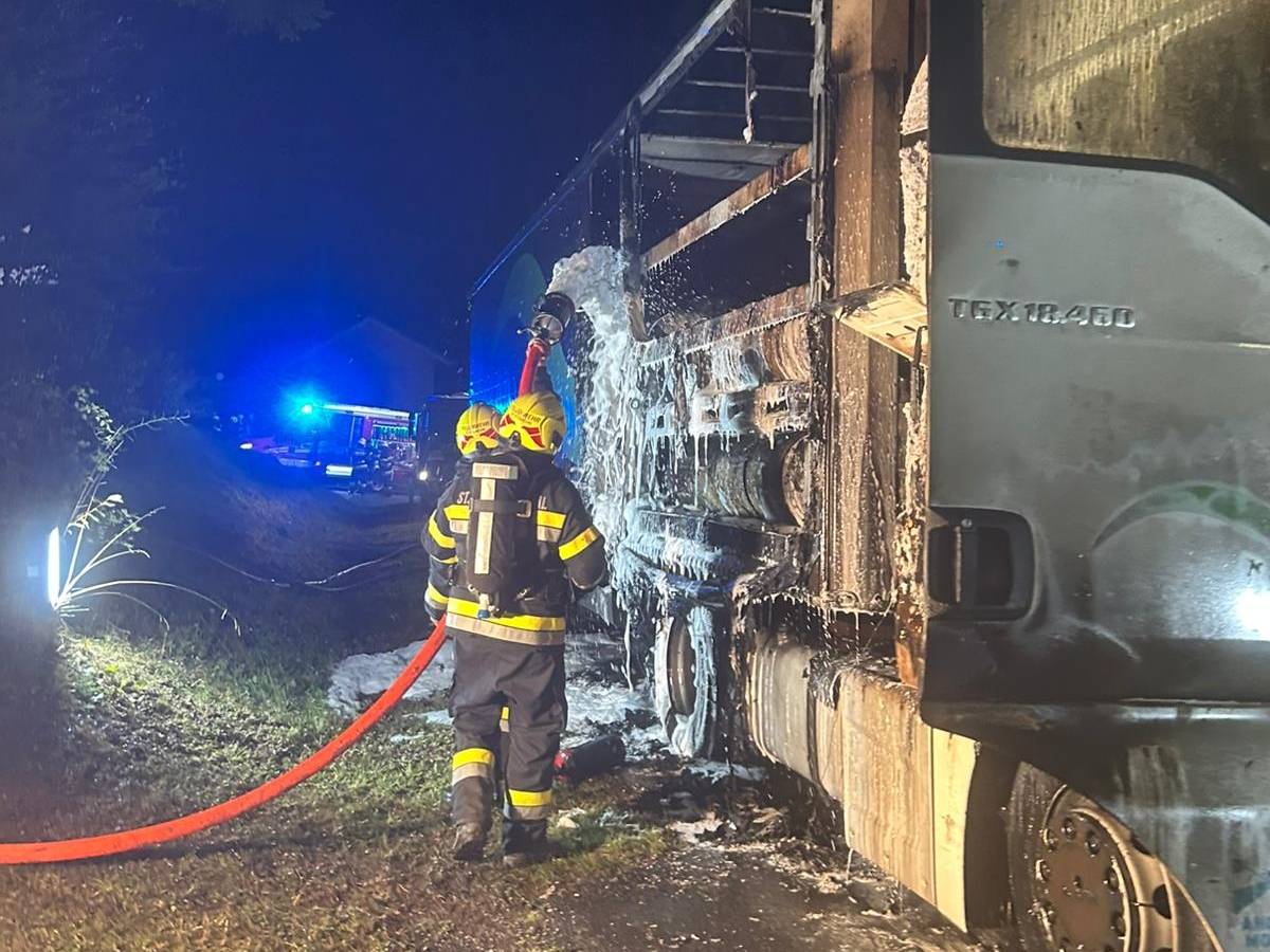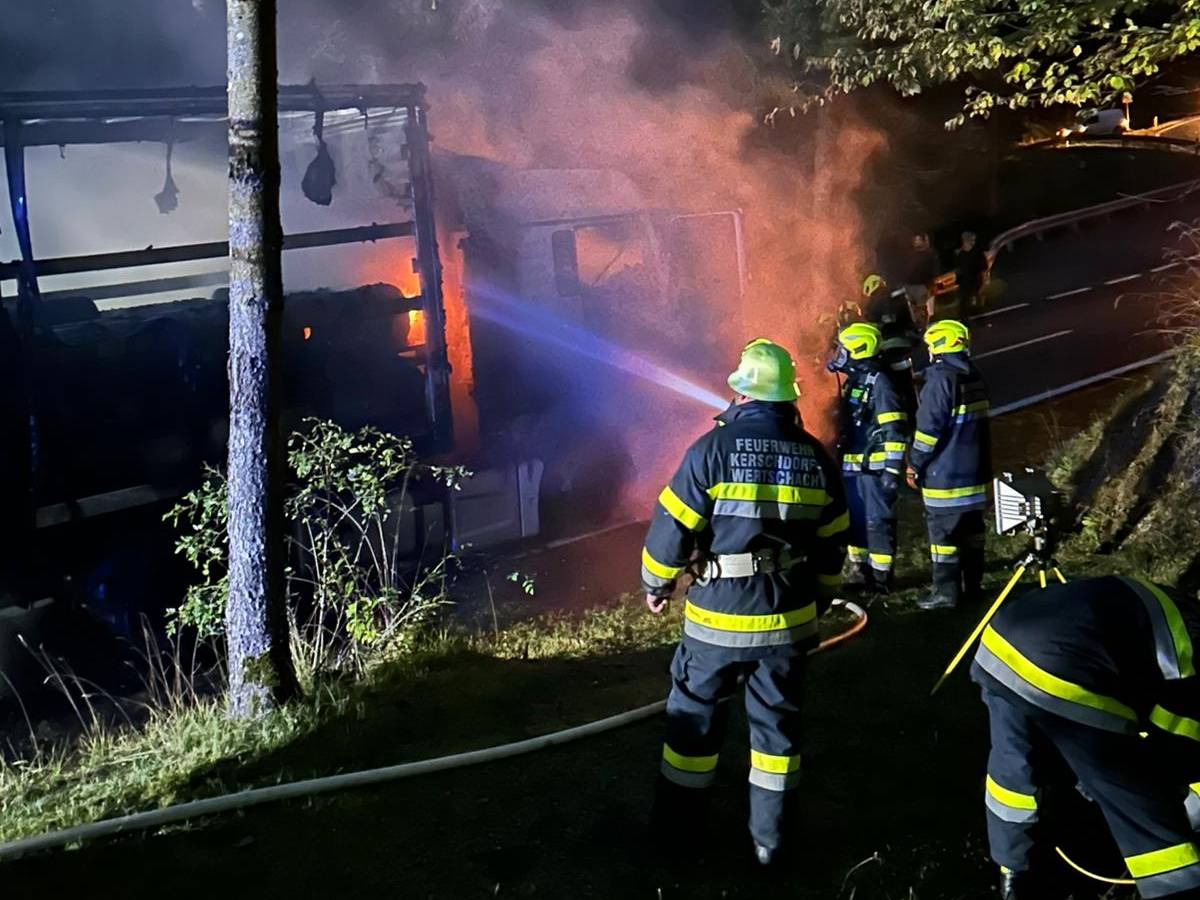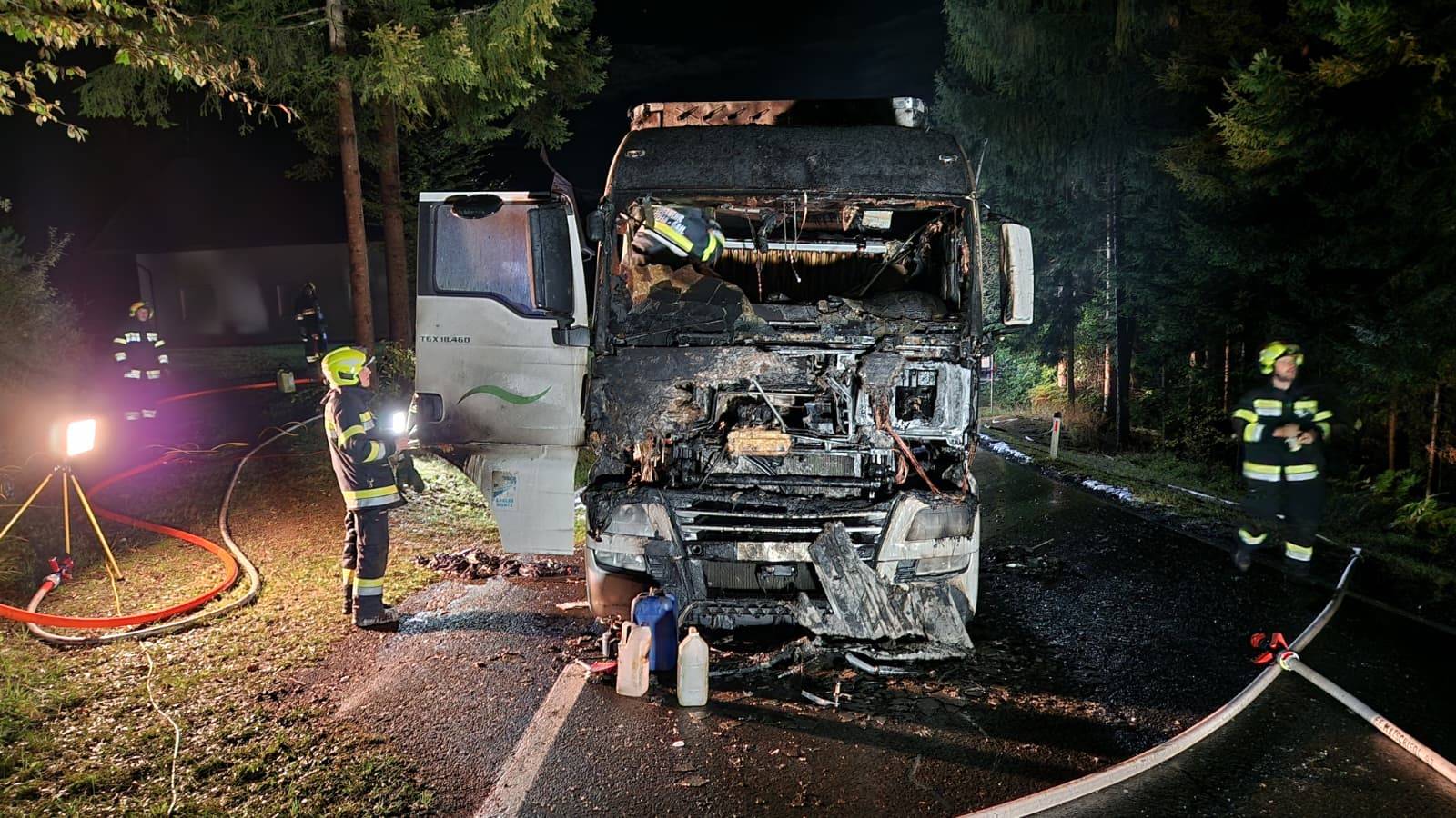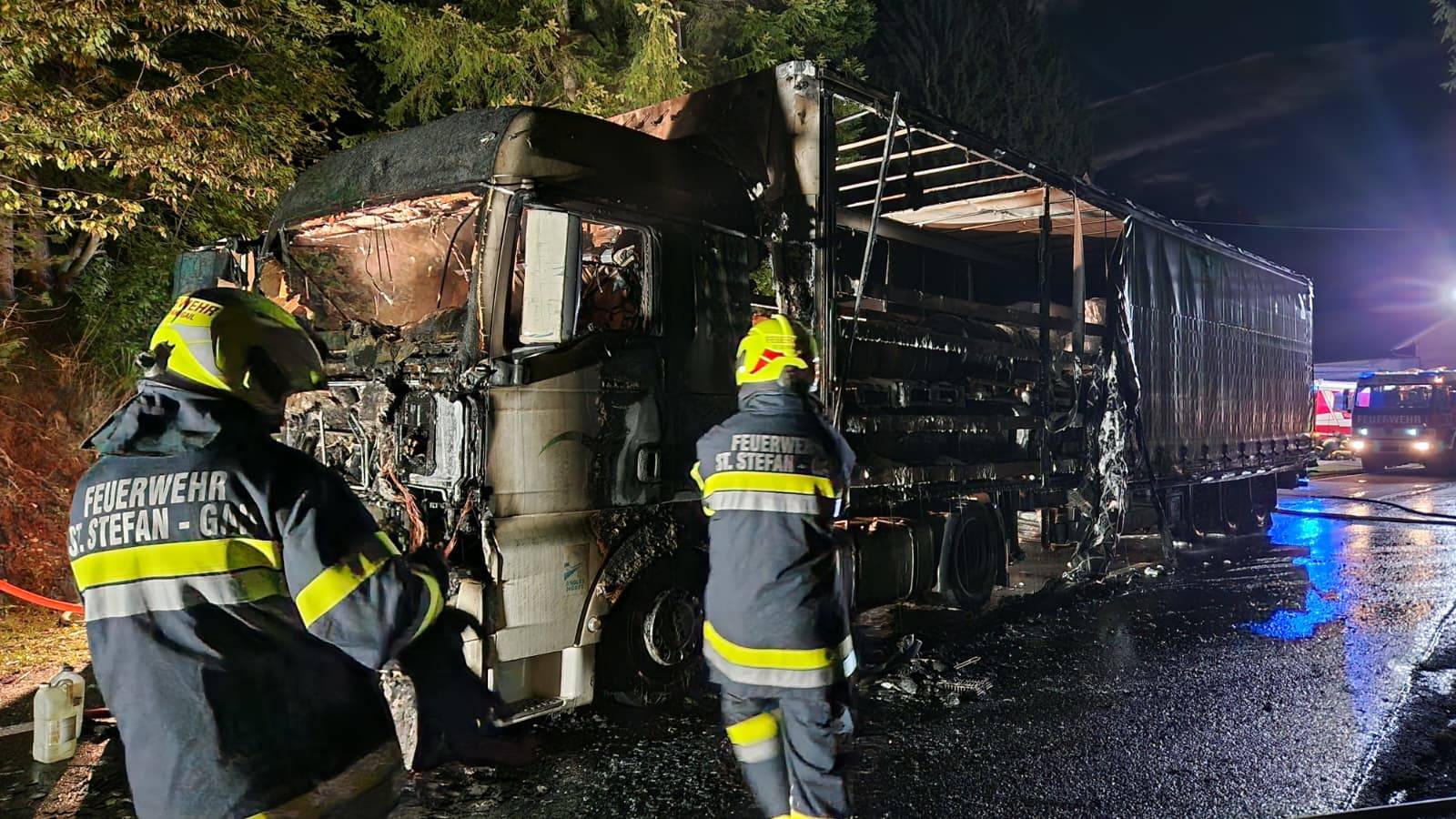 Der Bulgare fuhr mit seinem Sattelfahrzeug auf der Kreuzner Landesstraße in Richtung Norden. Im Bereich Matschiedl fing die Zugmaschine aus bislang unbekannter Ursache Feuer. Zeugen gaben später an, dass schon während der Fahrt Flüssigkeit auf die Fahrbahn floss die sich dort bereits entzündete, berichtet die Polizei St. Stefan. Die bereits brennende Flüssigkeit setzte dann die Fahrerkabine in Vollbrand. Der 73-Jährige konnte den LKW zum Stillstand bringen und unverletzt aussteigen. Kurze Zeit später griffen die Flammen auf den Anhänger über der mit Folienrollen beladen war.