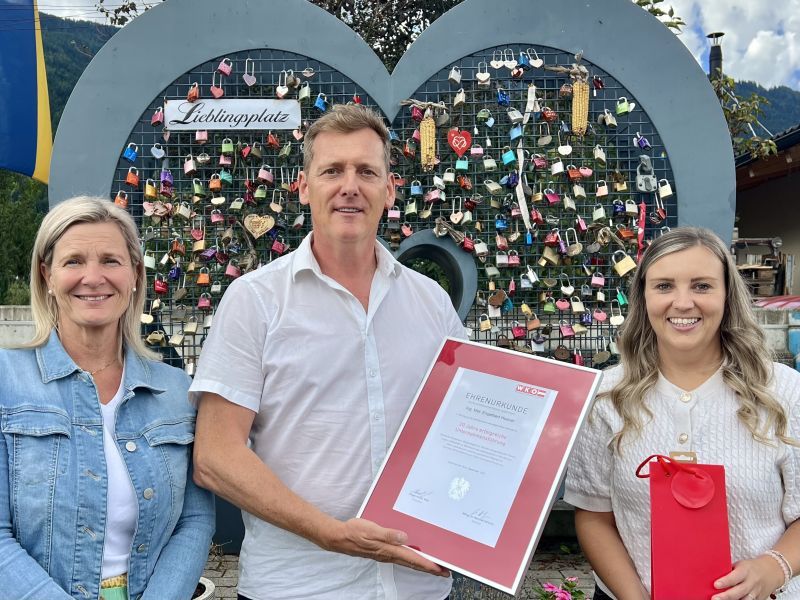 Die Wirtschaftskammer Kärnten mit Bezirksstellenleiterin Mag. (FH) Elke Basler und Sarah Profunser ehrte kürzlich Ing. Engelbert Hosner für 20 Jahre erfolgreiche Unternehmensführung als Baumeister.
