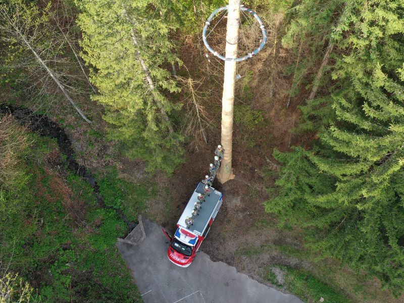 Normalerweise wird er gefällt, geschöpst (die Rinde entfernt) und einige Kilometer auf den Hauptplatz gekarrt: Der Maibaum. Anders heuer bei der FF Zwickenberg, dort ragt ein etwas „speziellerer“ Maibaum in die Höhe.