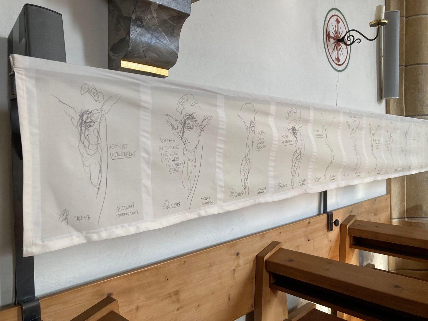 In St. Oswald in der Gemeinde Kartitsch haben Kreuzweg-Andachten eine lange Tradition. In diesem Jahr begleitet eine Kunstinstallation durch die Fastenzeit: 40 Zeichnungen des 2017 verstorbenen Osttiroler Malers Oswald Kollreider bilden ein 10 Meter langes Fastentuch. Dazu wurden die Textteile der kalenderartigen Zeichnungen vertont und können beim Abspielen angehört werden. Der Neffe von Oswald Kollreider hat die Zeichnungen durchforstet und die Installation mit dem sich stetig wiederholenden Motiv „Christus am Kreuz“ zusammengesetzt.
