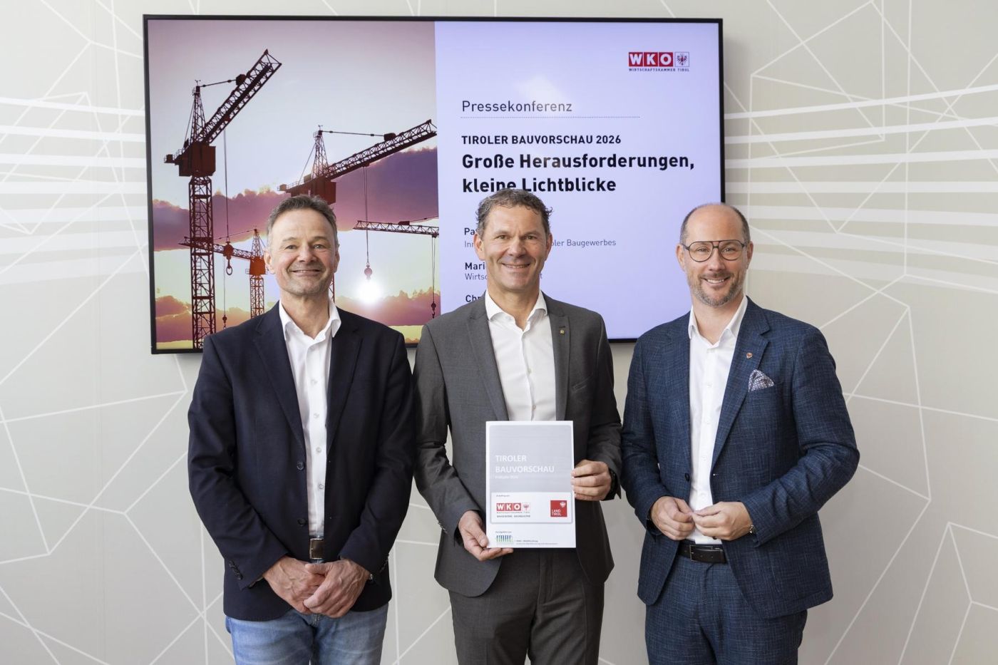 Landesbaudirektor Christian Molzer, Bau-Innungsmeister Patrick Weber und Wirtschaftslandesrat Mario Gerber (v.l.) präsentierten die Ergebnisse der „Tiroler Bauvorschau 2026“. © WK Tirol/Die Fotografen