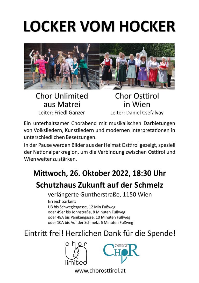 Am Mittwoch, 26. Oktober, abends, mitten in Wien im „Schutzhaus Zukunft auf der Schmelz“ wird ein gemeinsamer Abend vom Chor Osttirol in Wien und dem Chor Unlimited aus Matrei unter dem Motto: „Locker vom Hocker“ veranstaltet. Beginn ist um 18.30 Uhr.