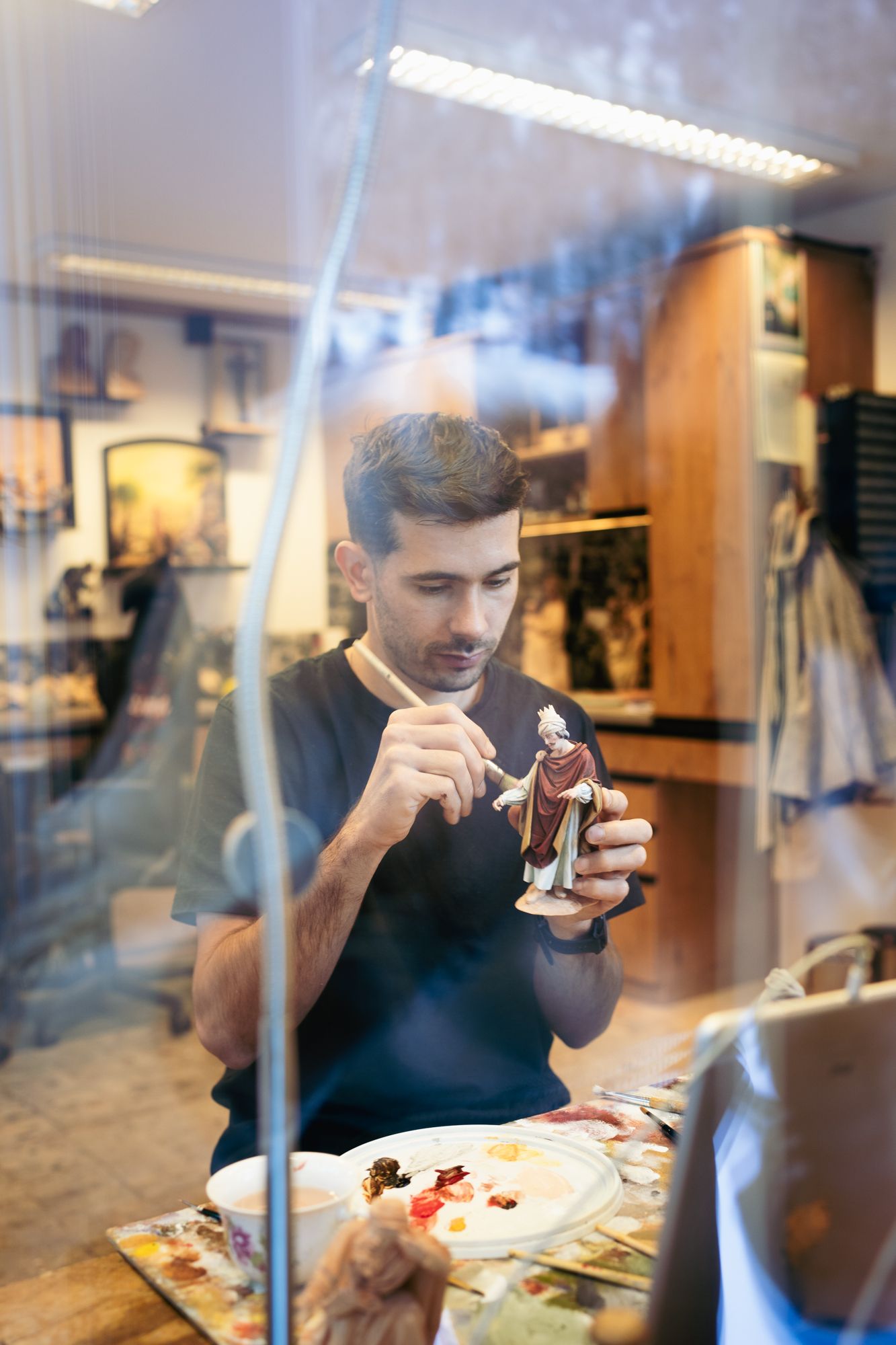 Minus sechs Grad hat es in Prägraten Morgen gegen 9 Uhr, die Sonne hat das Bergdorf im Hinteren Iseltal noch nicht erreicht. Manuel Egger-Budemair steht bereits seit drei Stunden in seiner warmen, hellen Werkstatt. Er arbeitet derzeit an mehreren Krippenfiguren zeitgleich. „Auf dem Titelbild sieht man einen Hirten.“ An einer ganzen Hirtengruppe arbeitet er, die Figuren sind für die Kirche in Roppen (Bezirk Imst) vorgesehen. 30 Zentimeter misst die Figur. Doch wie entsteht eigentlich eine Krippenfigur? „Zuerst muss ich mir Gedanken machen, in welche Richtung es gehen sollte. Dann zeichne ich mehrere Entwürfe“, erklärt Egger-Budemair. Der beste Entwurf kommt auf das Holz. „Der erste Schritt ist das Anhauen. Dann kommt das Anlegen, wo Feinheiten berücksichtigt werden.“ Im letzten Schritt arbeitet er die Figur bis ins kleinste Detail aus: „Ganz wichtig ist, dass die Figur lebt.“ Und schließlich bemalt er sie – natürlich selbst.
