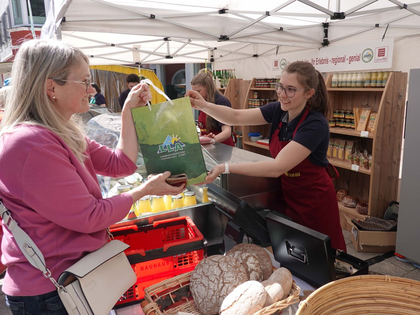 Das Schulprojekt der Landwirtschaftlichen Lehranstalt LLA Lienz in der Woche vor Ostern hat bereits Tradition. Die Schülerinnen und Schüler verkaufen an einem eigenen Stand am Lienzer Stadtmarkt selbst erzeugte Produkte aus dem Schulbetrieb Müllerhof. Die Jugendlichen lernen dabei nicht nur die Veredelung und Verarbeitung von Milch, Fleisch, Eiern, Obst usw. sondern auch das Prinzip der Direktvermarktung und die Kommunikation mit den Kundinnen und Kunden.