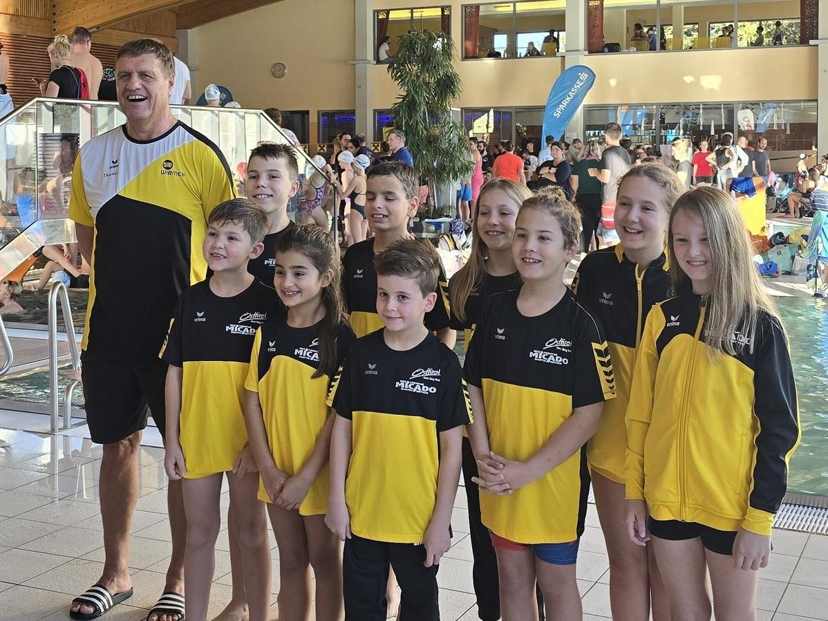 Die Schwimmerinnen und Schwimmer mit Trainer Mair Pepi der Schwimmunion Osttirol bei der ersten Station des Tiroler Kidscups in Leutasch. Foto: SU Osttirol