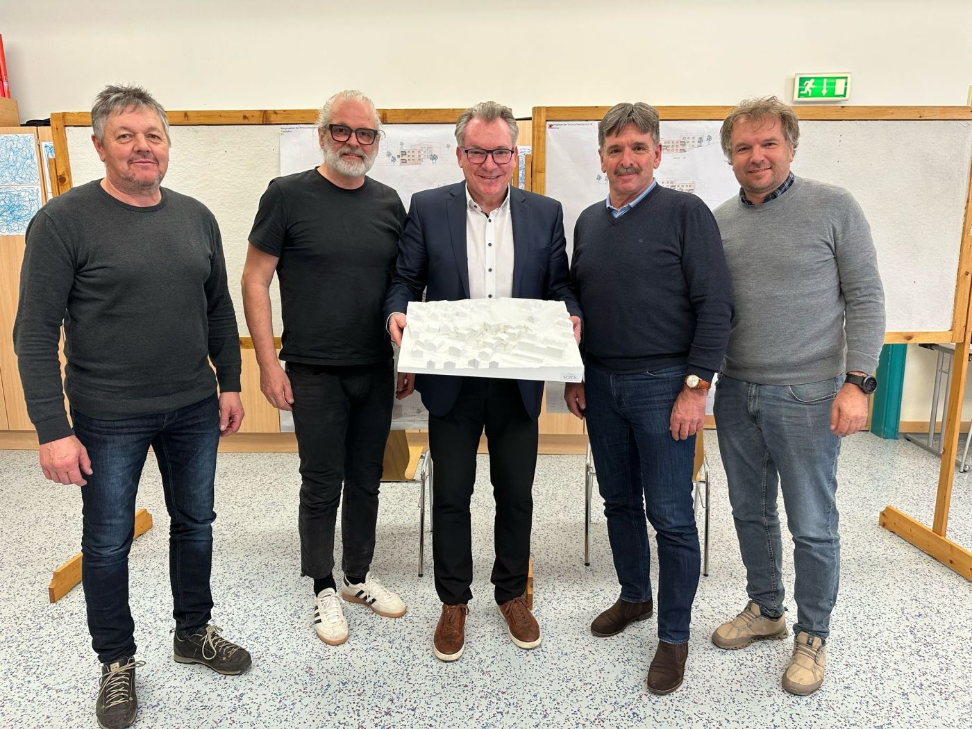 NHT-Geschäftsführer Johannes Tratter präsentiert mit (v.li.) Vizebürgermeister Wolfgang Gasser, Preisrichter Hanno Vogl-Fernheim, Bürgermeister Dietmar Ruggenthaler und Raumplaner Thomas Kranebitter die Pläne für ein neues Wohnprojekt in Virgen. Foto: NHT