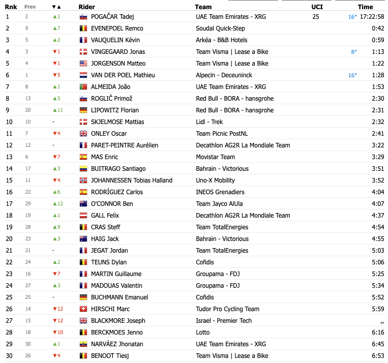 Gesamtklassement nach dem Zeitfahren. Screenshot: Pro Cycling Stats