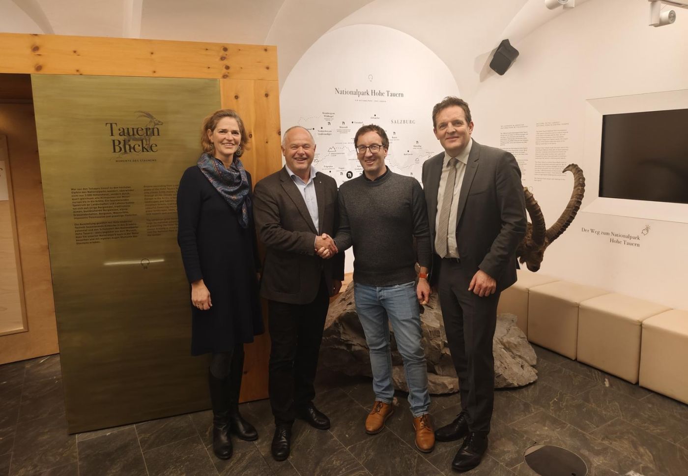 Hermann Stotter wünscht seinem Nachfolger Florian Jurgeit eine weiterhin vertrauensvolle Zusammenarbeit mit dem Nationalparkkuratorium. v.l.n.r.: Valerie Zacherl-Draxler (Vertreterin Bundesministerium), Hermann Stotter, Florian Jurgeit, Landesrat René Zumtobel. Foto: NPHT Raffler