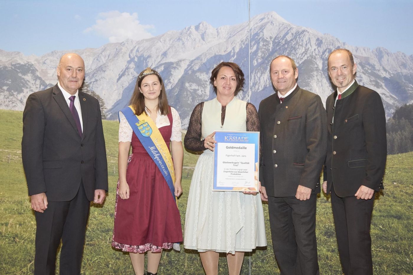 Obmann Sebastian Wimmer vom Verband der Molkerei und Käsereifachleute, Milchprinzessin Nadja Hörbinger, Landeshauptmannstellvertreter Josef Geisler und Josef Hechenberger, Präsident der Tiroler Landwirtschaftskammer, freuten sich gemeinsam mit Renate Jans vom Figerhof in Kals. © AMTirol, Krapf