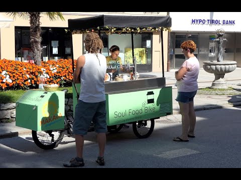 Vegane Wraps, also gerollte Teigfladen mit verschiedenen Füllungen, und Eistee – das serviert Verena Steiner in ihrem umgebauten Fahrrad, dem sogenannten „Soul Food Bike“. Jeden Tag in der Mittagszeit steht sie auf dem Lienzer Hauptplatz und bereitet ihre Speisen zu. Die Idee dazu ist der Jungunternehmerin im Stau auf dem Weg in den Urlaub gekommen, als vor ihr ein Foodtruck stand.