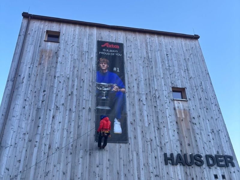 Auf dem Haus der Berge wurde eine große Plane mit der Botschaft „Sexten is always Proud of You“ angebracht.