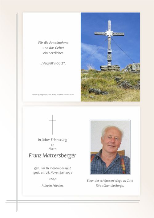 Für Alois Lobenwein spendeten Fam. Franz und Paula Lobenwein 500 € der Lebenshilfe Osttirol und 200 € der Pfarre Oberlienz; Anna Hunsamer 100 € dem Pfarramt Oberlienz und 100 € der Lebenshilfe Osttirol; Fam. Josef Lobenwein 100 € der Pfarre Oberlienz; Annemarie Pichler 100 € der Kirche St. Helena.